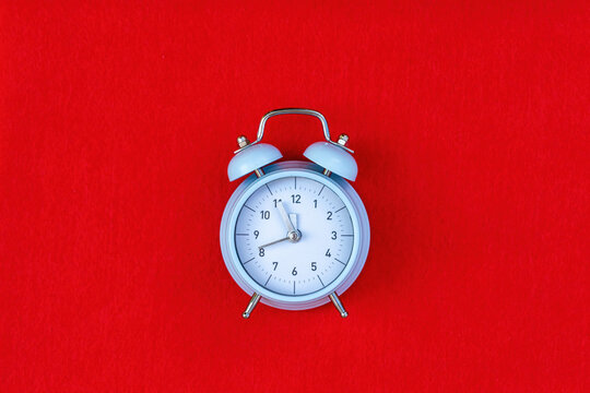 Blue retro alarm clock on red background with copy space. Concept of time, 5 minutes to 12, until the New year