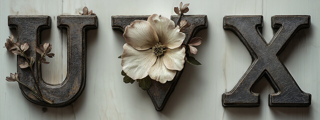 A set of floral alphabet letters U  V X vector design, simple line art drawing with black ink on a white background.