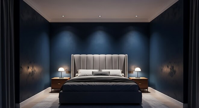 Starting blocks lined at indoor competition pool with lane ropes and water reflections