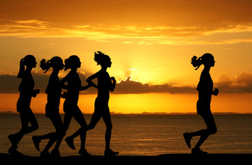 Woman running on coastal promenade with hud fitness overlays tracking pace and heart rate