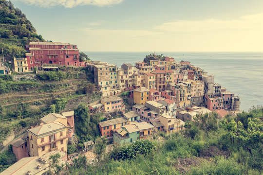 Night scenery of Manarola on vertical cliffs by the rocky coast with beautiful lights reflected on sea water, an amazing village in Cinque Terre National Park, Liguria, Italy, Europe (Long Exposure)