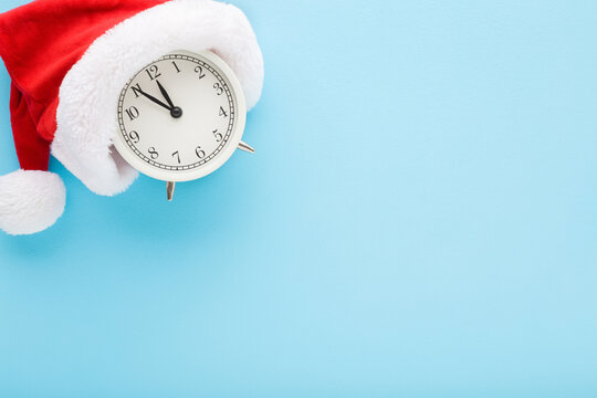 Red hat with white fur and alarm clock on blue table background. Pastel color. Closeup. Countdown to midnight. Counting last moments before Christmas or New Year. Empty place for text. Top down view.