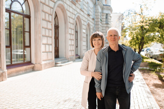 Senior happy couple of stylish man and woman 60-65 year old walking together on streets at city outdoors. Wellness lifestyle. Happiness.