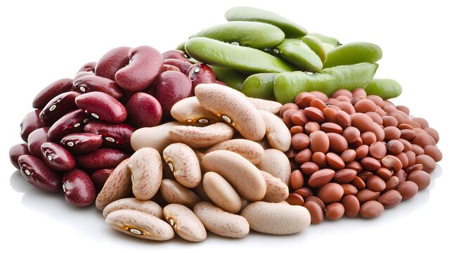 Mixed variety of dry beans spread flat, shot with mirrorless camera, 50mm lens, showcasing natural tones and shapes with soft lighting on white background