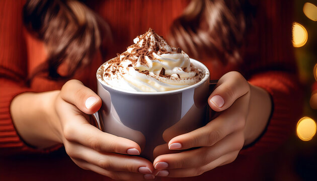 Hands hold a frothy mug of hot chocolate topped with whipped cream and chocolate shavings i_1(530)