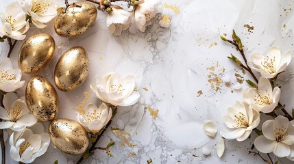 07231249 539. Top view of gleaming golden Easter eggs and elegant flowers on a light, neutral background, featuring ample space for a personalized Easter greeting or message