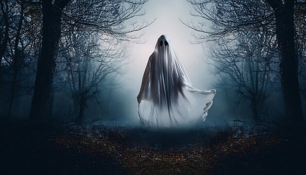 Ghostly apparition floating in a dark, spooky Halloween scene. _1(545)