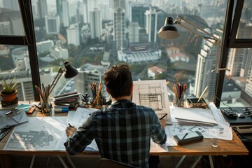A creative architect sitting at a desk cluttered with blueprints, drafts, and architectural tools, deeply focused on sketching a new design