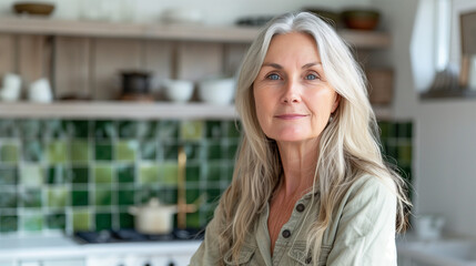 Woman Standing on White Kitchen Interior. Blond Hair, Little Smile (45, 50, 55, 60 years old). Housewife, Mature, Cook, Culinary, Lady, Blond