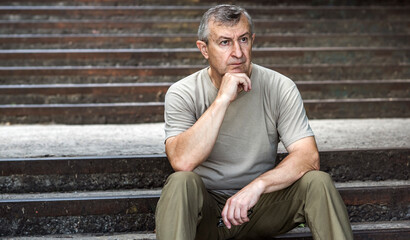 Pensive European senior man, emotional portrait of reflection and life challenges. Emotive portrait of a 55–65 year old man outdoors