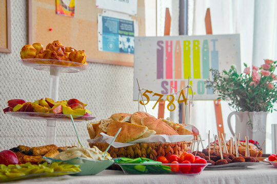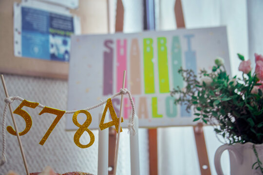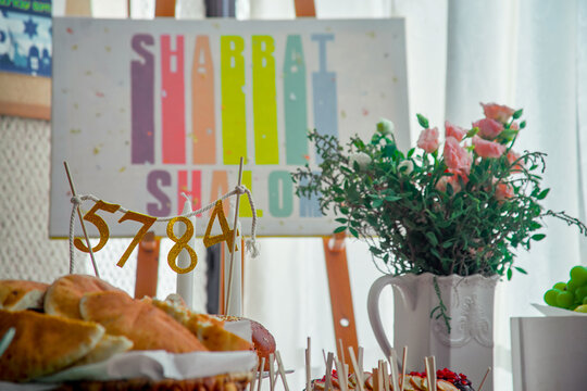 Greeting numbers 5784 for Rosh Hashanah celebration (Jewish New Year) with festive dishes on the table