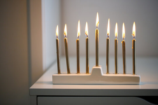 Chanukiah with burning candles. Concept of the Jewish holiday Hanukkah.