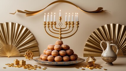 Jewish religious celebration featuring a traditional candelabra, donuts, wooden dreidel, and an oil jug. Golden backdrop.