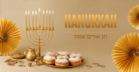 Jewish religious holiday Hanukkah with holiday Hanukkah (traditional candelabra) with  donut, wooden dreidel (spinning top), oil jug. Golden baner