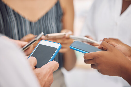 Hands of people in circle on smartphone, phone or cellphone communication sharing 5g data email. Web, wifi tech and social media group online chat, nfc or bluetooth file gaming app or money transfer.