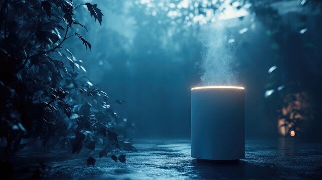 A futuristic air purifier glowing softly in a dimly lit room, with visible clean air flow represented by light beams.