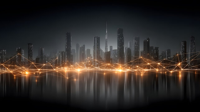 Modern city with wireless network connection and city scape concept.Wireless network and Connection technology concept with city background at night.