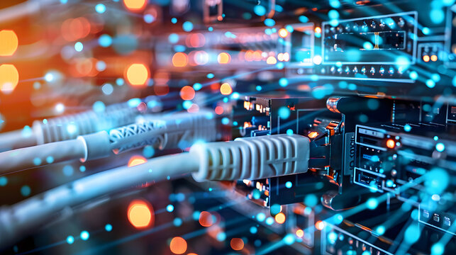 Network cable connecting server, data center, glowing lights, background activity, IT infrastructure