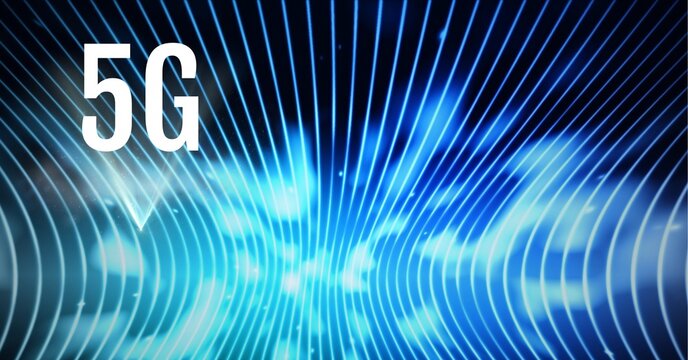 Composition of 5g text over blue light trails and glowing light clouds on blue background