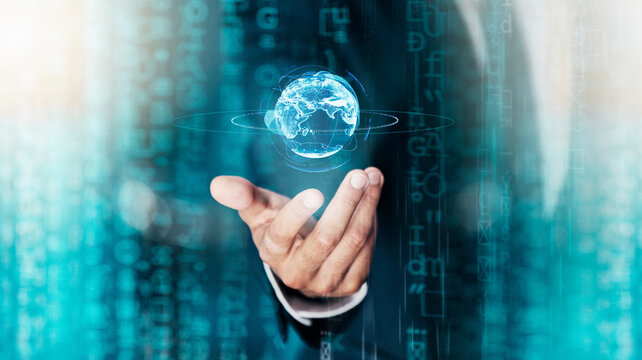 Digital overlay, earth hologram and futuristic global technology future of network connection, online iot infrastructure and cloud computing software. Double exposure, 5g internet and blockchain tech