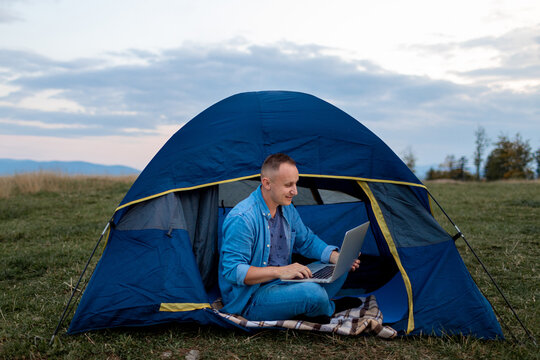 Man working on laptop in tent in nature. Young freelancer sitting in camp. Relaxing in mountains. Remote work, outdoor activity in summer. internet 5G.