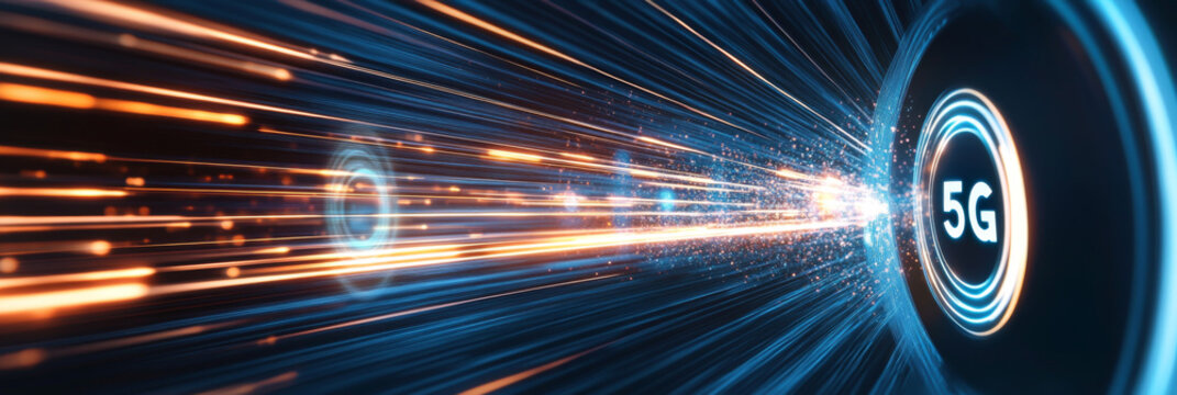 Innovative wireless technology concept with a sparkling 5G sign and digital interface elements floating around.
