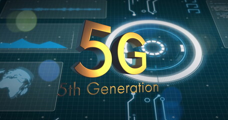 5g text and round scanner over woman taking a selfie from smartphone against technology background