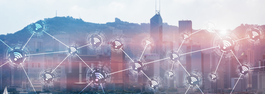 Wifi city communication technology fast internet connection 5g wireless concept. modern city view with icons.
