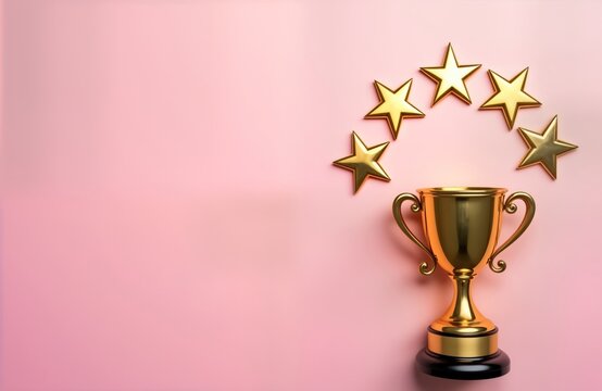 Gold trophy cup with five stars on pastel pink background. Flat lay design emphasizes victory concept. First place winner of competition. Success, achievement highlighted. Ideal for websites