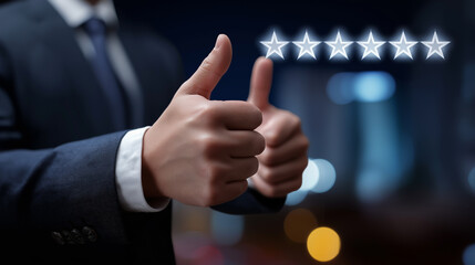 Businessman in suit showing two thumbs up with glowing stars between hands, representing excellent customer service, high rating, or top performance.