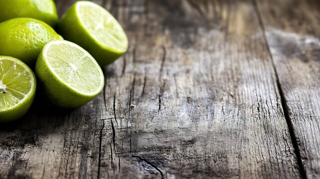 Freshly cut limes arranged on a rustic wooden surface inviting tropical vibes : Generative AI