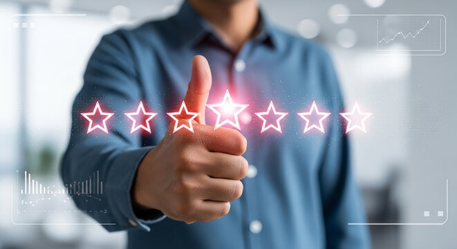 Man showing thumbs up with glowing red star rating icons on screen representing customer feedback satisfaction positive review and excellent service experience
