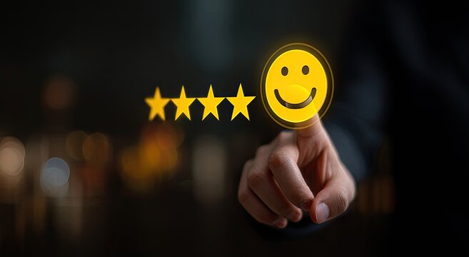 Businessman touching virtual smiley face and five-star rating icon, representing customer satisfaction, service review, positive feedback, user experience, and online reputation management.