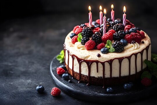 Sweet Birthday cake with number 5 on top on colorful bokeh background, 5th years old happy birthday Cake, copy space