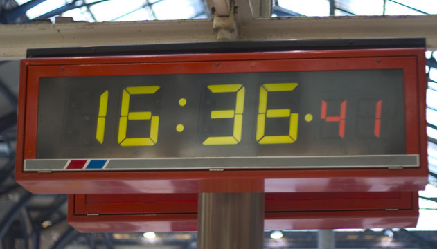 A digital clock displaying the time six o clock pm against a black background with two buttons visible