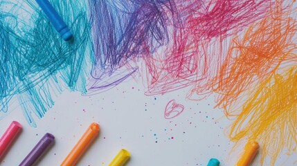 Close-up of a group of colorful crayons scattered on a white surface. there are six crayon colors in total, including blue, pink, purple, orange, yellow, green, and purple.