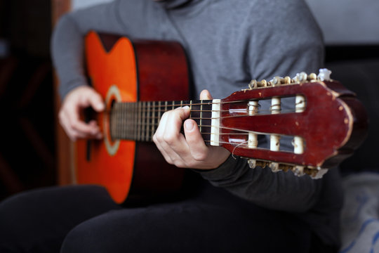 Close-up of hands strumming acoustic guitar in relaxed home setting