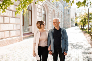 Senior happy couple of stylish man and woman 60-65 year old walking together on streets at city outdoors. Wellness lifestyle.