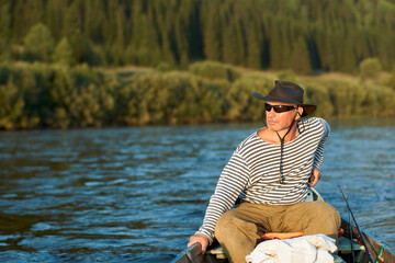 A bruA brutal man, a fisherman aged 60 plus in a vest and a black hat, drives a motor boat on the river. Sunset time on the river. The concept of tourism and recreation. High resolution photo
