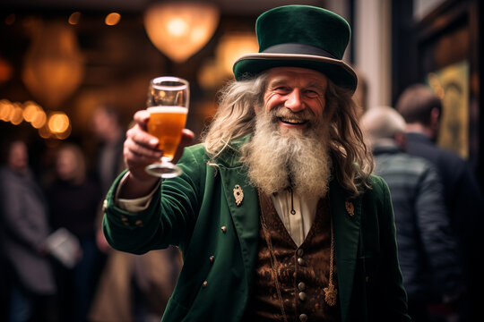 Portrait of a 60-year-old man with a beard and long gray hair celebrating St. Patrick's Day in a bar with a glass of beer in his hand.