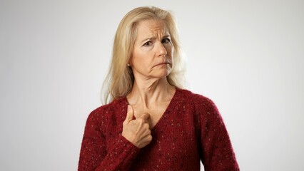 Elderly mature blonde woman lady 50s years old wears red sweater look camera pointing fingers herself ask say who me no thanks i do not need it isolated on solid white background studio portrait