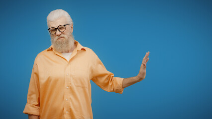 Displeased senior man makes a gesture of refusal, expressing negative emotion and rejection