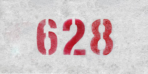 Red Number 628 on the white wall. Spray paint.