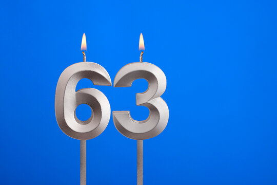 Number 63 golden celebration birthday candle on white with confetti background. Sixty-three years birthday. Concept of celebrating birthday, anniversary.
