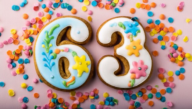 Decorated cookie, number 63, image for birthday or anniversary celebration