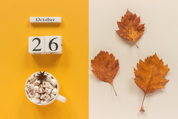 Calendar for May 26: cubes with the number 26, the name of the month of May in English, a cup of coffee in the shape of a heart with a dandelion flower, top view