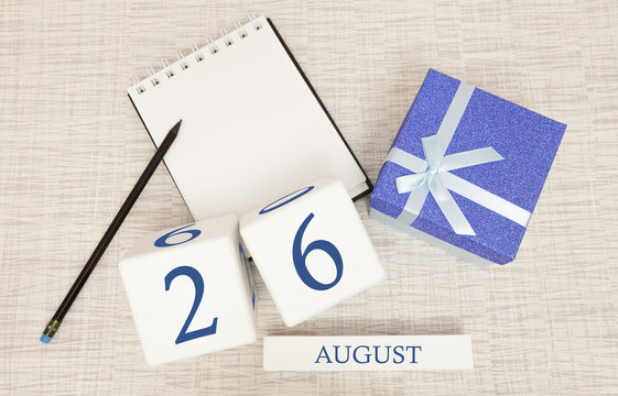 Calendar with trendy blue text and numbers for August 26 and a gift in a box.