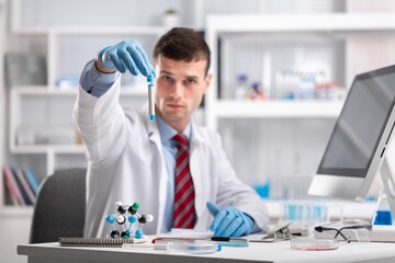 Researchers scientist working analysis with liquid test tube in the laboratory, chemistry science or medical biology experiment technology, pharmacy development solution