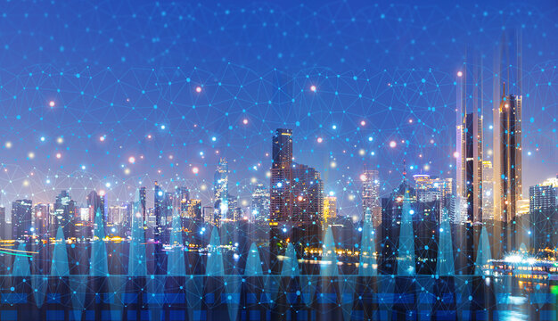 Modern city with wireless network connection and city scape concept.Wireless network and Connection technology concept with city background at night