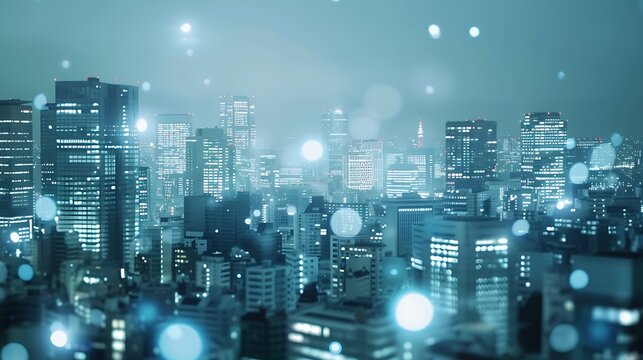 Modern city with wireless network connection and city scape concept.Wireless network and Connection technology concept with city background at night.